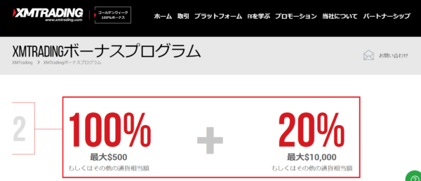 海外FX業者の中でも人気の高いXM Tradingは100%+20%入金ボーナスが常時開催中です。XM Tradingの入金ボーナスは、入金した額に対して2段階のボーナスが設定されており、入金額に対し合計$10,500の金額が付加される豪華ボーナスです。このボーナスは付与回数に制限がなく、ボーナスを1回で受け取るのも複数回にわけて受け取るのも可能です。KIWAMI極口座およびXM Trading Zero口座は入金ボーナス受け取り対象外で、Micro口座、Standard口座でのみ入金ボーナスは付与されます。