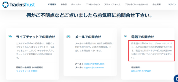 TradersTrustも公式サイトの日本語表記がわかりにくい海外FX業者のひとつです。TOPページなどは比較的わかりやすいといえますが、それでも初心者向けとしては情報が少なく、口座開設を行うにあたっての十分な情報があるとは言いにくいです。またお問い合わせ(URL: https://traders-trust.com/ja/live-accounts/ )にてライブチャット、メール、電話によるお問い合わせが可能と記載されていますが、「電話でのサポートは英語のみ」と書かれており、日本人スタッフがいないことがほぼ確定しています。