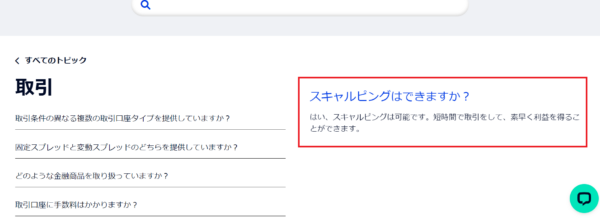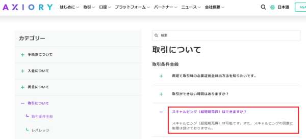 取引環境の良さに定評のあるAXIORYでは、スキャルピングが可能な旨が「よくある質問」に記載されています。AXIORYの場合はスキャルピングが可能でかつ回数制限がないため、スキャルピングトレーダーには最適な環境が用意されているといえるでしょう。